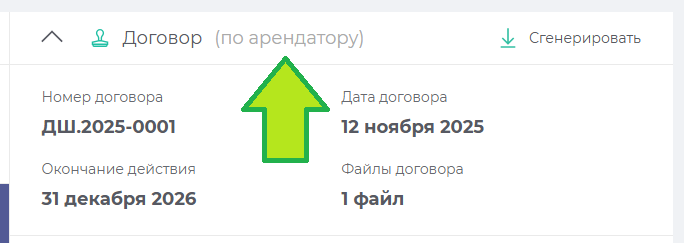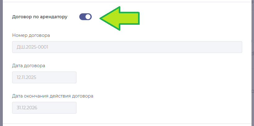 Чтобы использовать на на проекте/заказе постоянный договор арендатора, вместо отдельного, активируйте в форме редактирования переключатель Договор по арендатору.