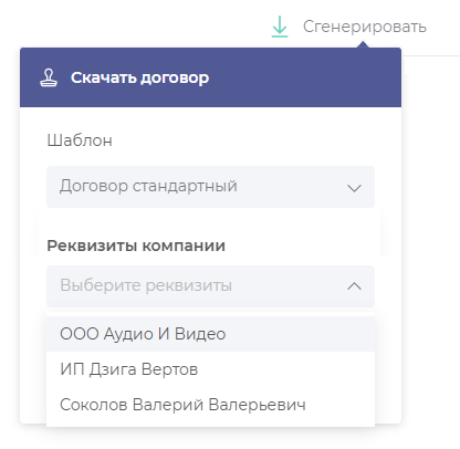 - Ниже вы можете выбрать реквизиты вашей компании, которые попадут в сгенерированный договор как реквизиты арендодателя.