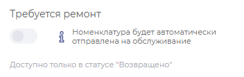 - Переключатель Требуется ремонт доступен только для позиций в статусе Завершено (т.к. нельзя отправить в ремонт то, что еще даже не вернулось из аренды).