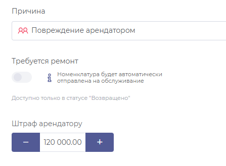 - Выберите Причину. Только Повреждение арендатором влияет на логику работы, остальные типы причин указываются только для ведения истории;