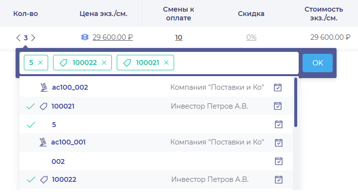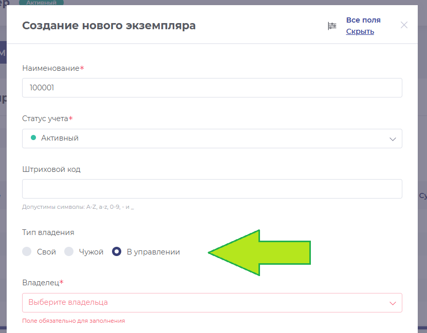 Обязательно укажите владельца оборудования. Это должен быть незаблокированный контрагент с видом деятельности, поддерживающим субаренду - Поставщик или Арендатор и поставщик.