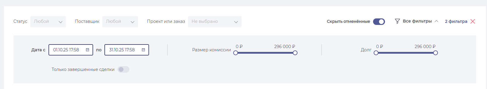 В списке вы можете работать как обычно - доступны фильтры, скрытие отмененных комиссий, выбор нужных колонок, а также выгрузка.