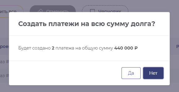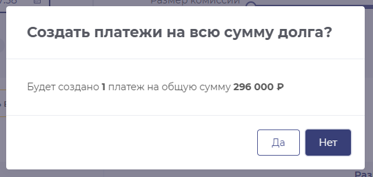 5 Система предложит создать платежи по всем комиссиям с долгом из числа выбранных;
