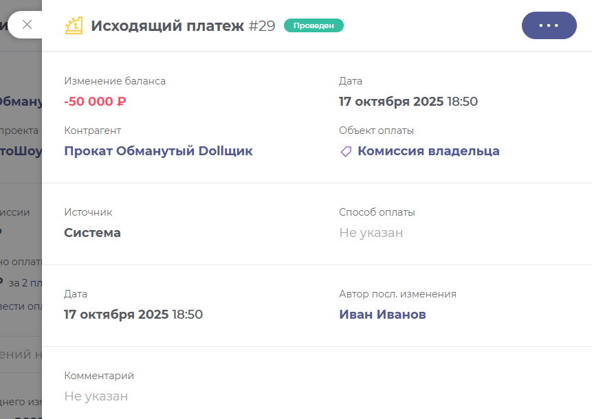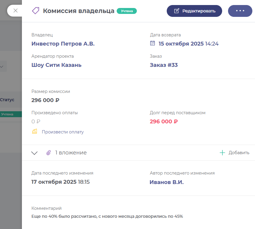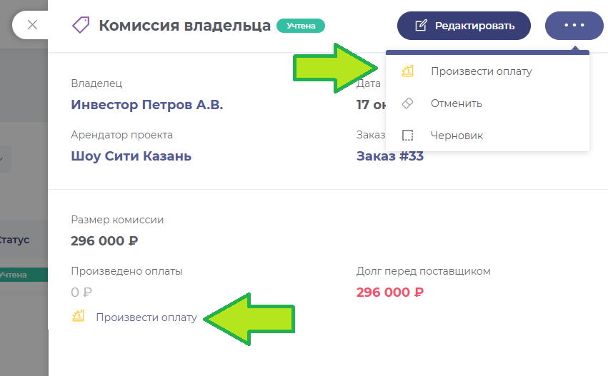 На карточке платежа также можно нажать и увидеть объект оплаты, в нашем случае Комиссию владельца