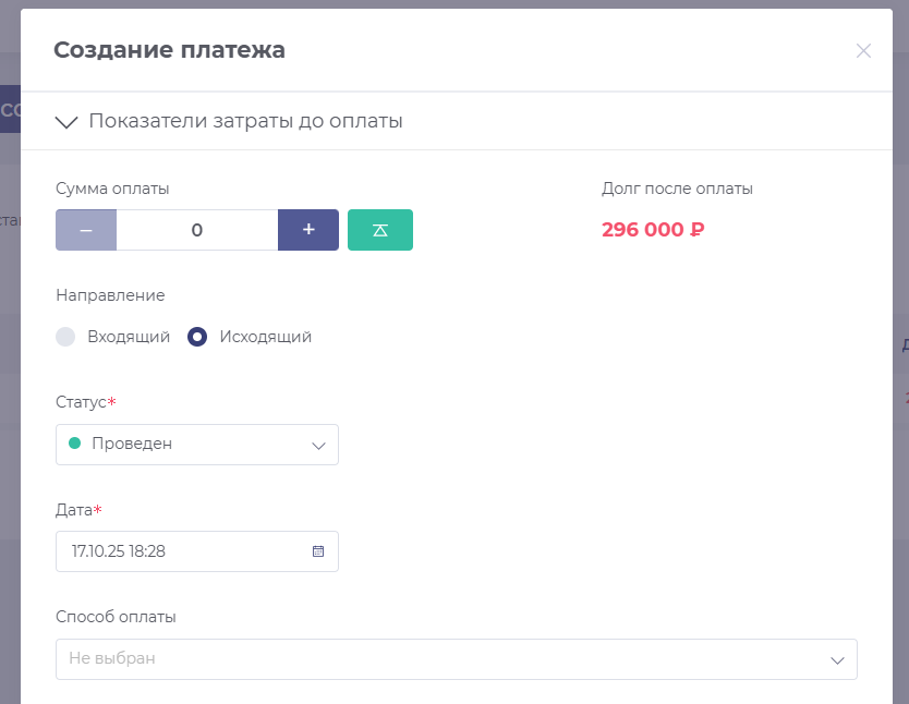 В таком случае вы регистрируете оплату по одной конкретной комиссии владельца, окно создания платежа стандартное: