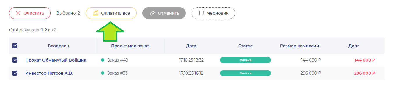 4 Выберите галочками массово все комиссии по которым хотите произвести оплату и нажмите Оплатить все;