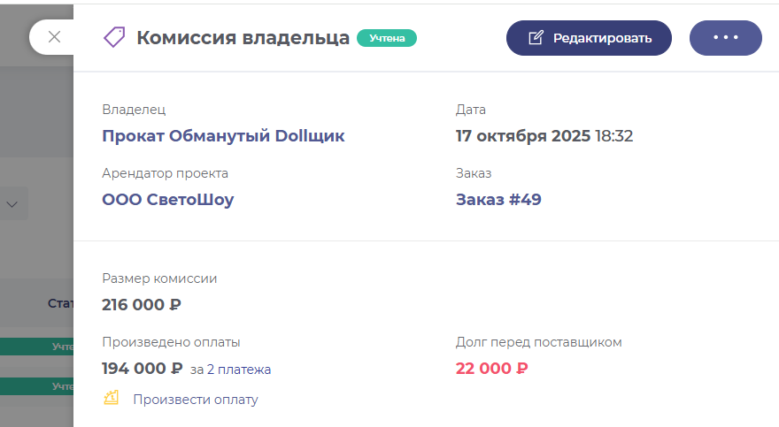 Он позволяет задать процент, который полагается владельцу и автоматически начислять комиссии, учитывать оплаты по ним и отслеживать долги.
