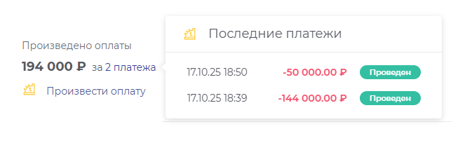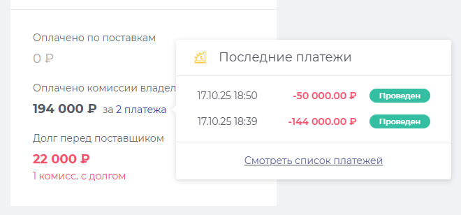 Показывается число платежей, сумма оплат и оставшийся долг по комиссиям. При нажатии на кол-во платежей можно увидеть их список.