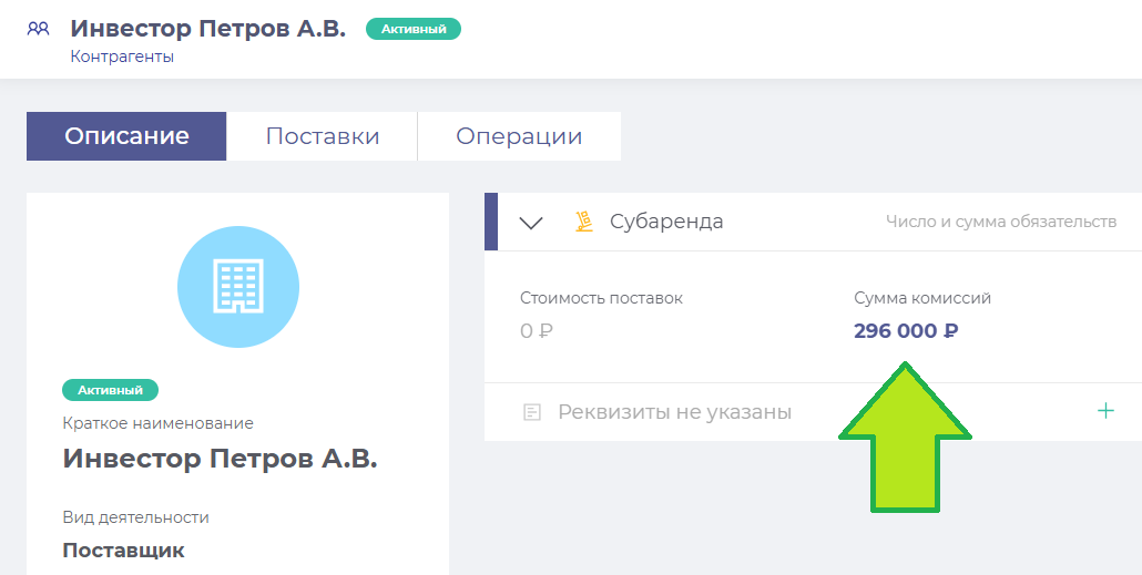 В карточке контрагента, который является владельцем имущества, также выводится сумма всех причитающихся ему комиссий: