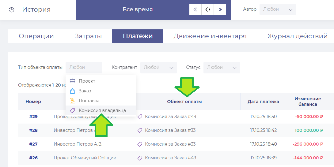 Общем списке платежей в разделе История, можно просмотреть все платежи по Комиссиям, выбрав соответствующее значение в фильтре Тип объекта оплаты