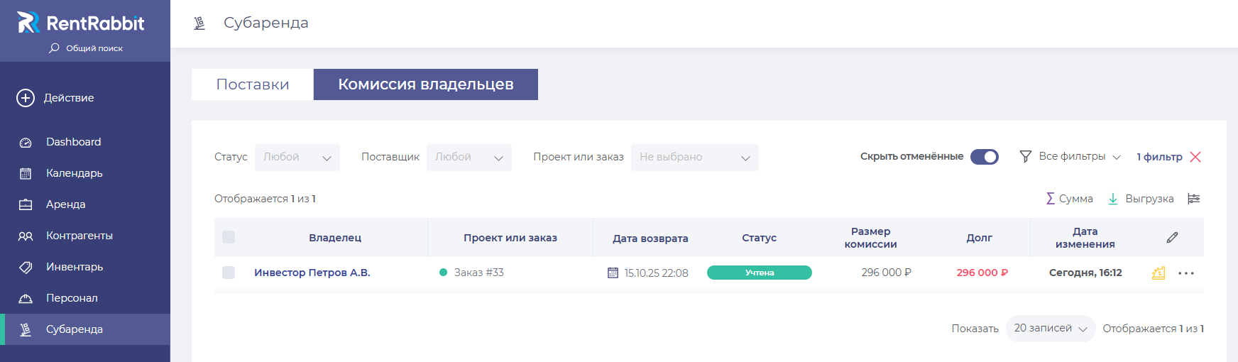 После этого в разделе Субаренда / Комиссия владельцев будет создана запись:
